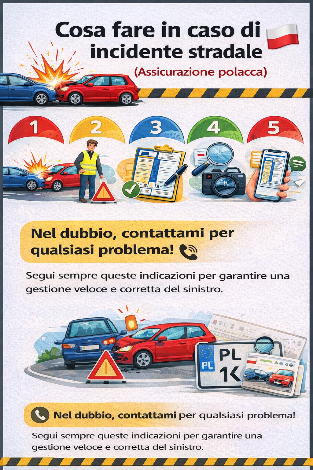 Il modulo europeo di constatazione amichevole che ti forniamo è valido anche con assicurazione polacca. Compilalo in modo chiaro e completo. Deve essere firmato da entrambi i conducenti